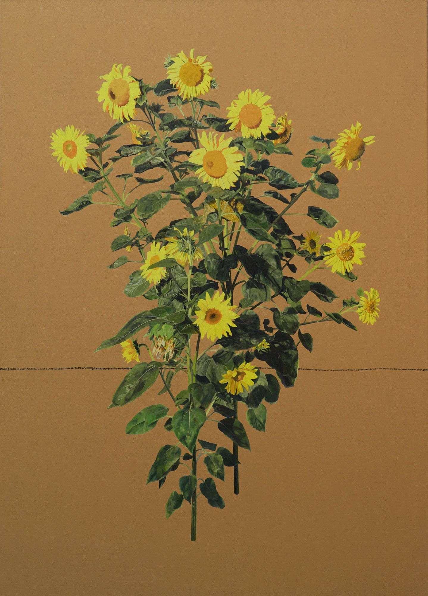 The compositions often carrying a sense of symmetry - not in exact form, but in balance, poise, and control. Whether rendered in quartz sand, oil paint, or the clinical palette of simulation, each work holds the viewer at a distance. We are not invited in. We are made to observe.